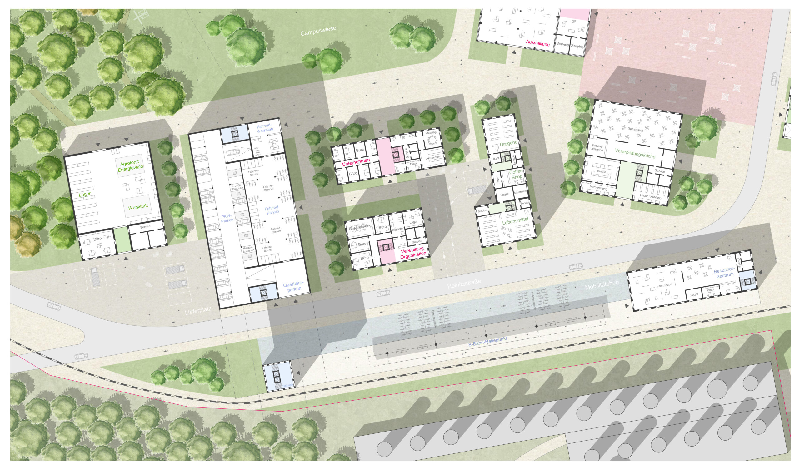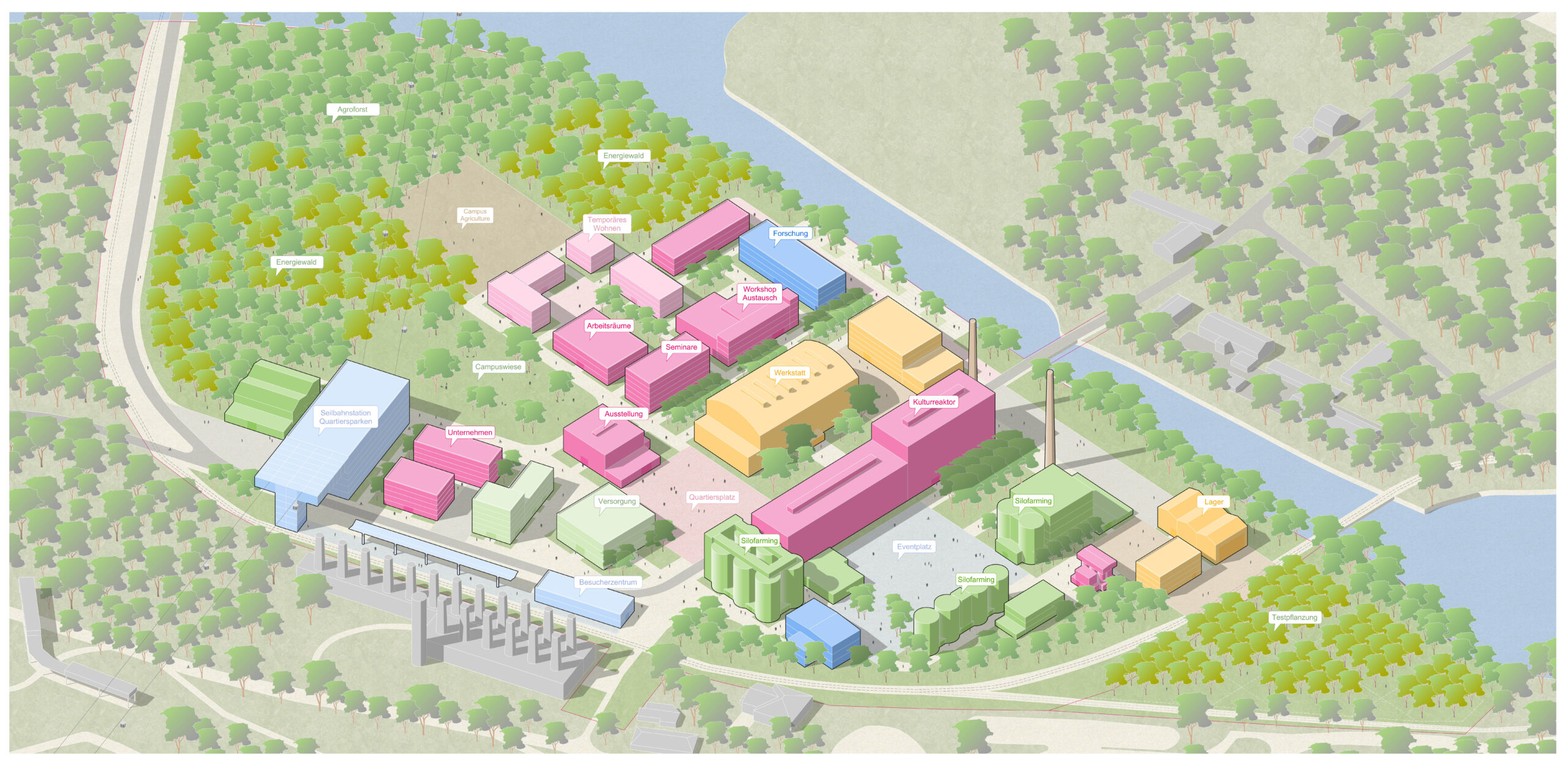 Die Stadt Rüdersdorf wird seit Jahrhunderten vom Kalkabbau geprägt. Das alte stillgelgte Zementwerk soll im Rahmen des AIV Schinkel – Wettbewerbes wieder zum Leben erweckt werden. Die zunehmende Perspektivlosigkeit der jungen Generation in Rüdersdorf sowie wenig Bildungs- und Freizeitangebote führen zu einer Bevölkerungsabwanderung nach Berlin. Durch das Konzept des Kooperativcampus (CoopCampus) soll sowohl der Bevölkerung Rüdersdorfs eine zukünftige Entwicklungsperspektive gegeben, als auch das Gelände des ehemaligen Futterphosphatwerks einem neuen Nutzen zugeführt werden. Die Kooperation erfolgt auf zwei Ebenen. Zum einen sollen hier „Stuzubis“ mit Unternehmen in Kontakt treten, um Praxiserfahrungen zu sammeln und so dem Fachkräftemangel entgegenzuwirken. Die zweite Ebene der Kooperation erfolgt inhaltlich. Die bereits in Rüdersdorf ansässige Bauindustrie bildet dabei einen wichtigen Themenschwerpunkt. Mit den Themenfeldern der Erneuerbaren Energie und dem Indoor Farming entsteht ein Dreiklang, der Rüdersdorf in einen zukunftsweisenden Prozess einführt. Der CoopCampus soll neben der (Aus-)Bildung und Forschung temporäres Wohnen ermöglichen sowie auch Erholungs- und Kulturräume bieten, welche gleichermaßen von Touristen und Einwohnern genutzt werden können. Durch die Verknüpfung der bereits ansässigen Unternehmen, wie dem Global Player CEMEX, soll sich Rüdersdorf zu einem kooperativen Zukunftsstandort mit überregionaler Strahlkraft entwickeln.